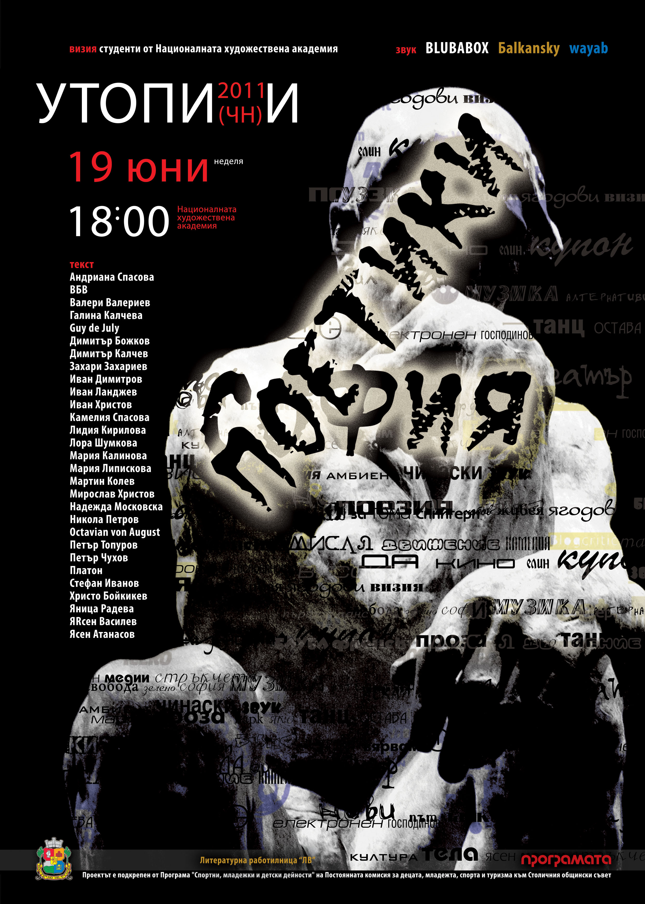 Пролетното издание на СОФИЯ: ПОЕТИКИ ще представи проекта УТОПИИ, „изработен” в Литературната работилница на „Литературен вестник” от Андриана Спасова, ВБВ, Валери Валериев, Галина Калчева, Guy de July, Димитър Божков, Димитър Калчев, Емил Христов, Захари Захариев, Иван Димитров, Иван Ланджев, Иван Христов, Камелия Спасова , Лидия Кирилова, Лора Шумкова, Мария Калинова, Мария Липискова, Мартин Колев, Мирослав Христов, Надежда Московска, Никола Петров, Octavian von August, Петър Топуров, Петър Чухов, Платон, Стефан Иванов, Христо Бойкикев,Яница Радева, ЯRсен Василев, Ясен Атанасов.